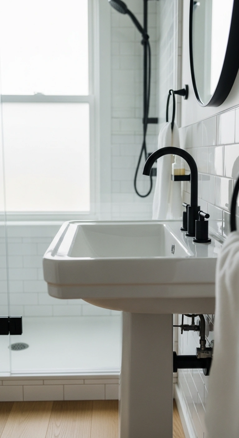 Matte black fixtures create a calm and sophisticated finish. Instead of shiny surfaces, the soft texture absorbs light and feels smooth to the eye. Picture a white porcelain sink paired with a matte black faucet and matching shower head. The black elements frame the space without overpowering it. The result feels intentional and high-end. It adds quiet drama without making the room feel dark.