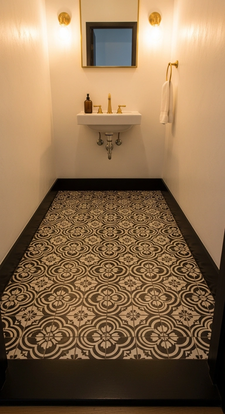 Keep the rest of the room calm if you choose bold flooring. Use solid white walls and simple black accents. In small bathrooms, choose smaller tile patterns to avoid overwhelming the space. Pair patterned floors with a plain white shower curtain for balance. This design choice works especially well in powder rooms where you can be more playful.