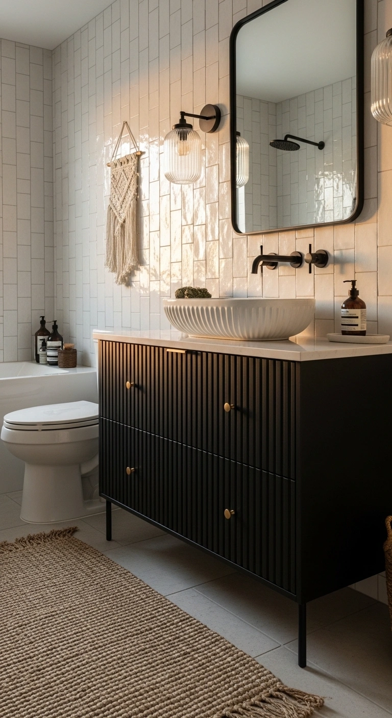 Small black décor accents create cohesion. Think black-framed mirrors, soap dispensers, or candle holders. These pieces repeat the black tone throughout the room. The repetition creates visual harmony. The space feels styled but not cluttered. It maintains a clean and modern aesthetic.
