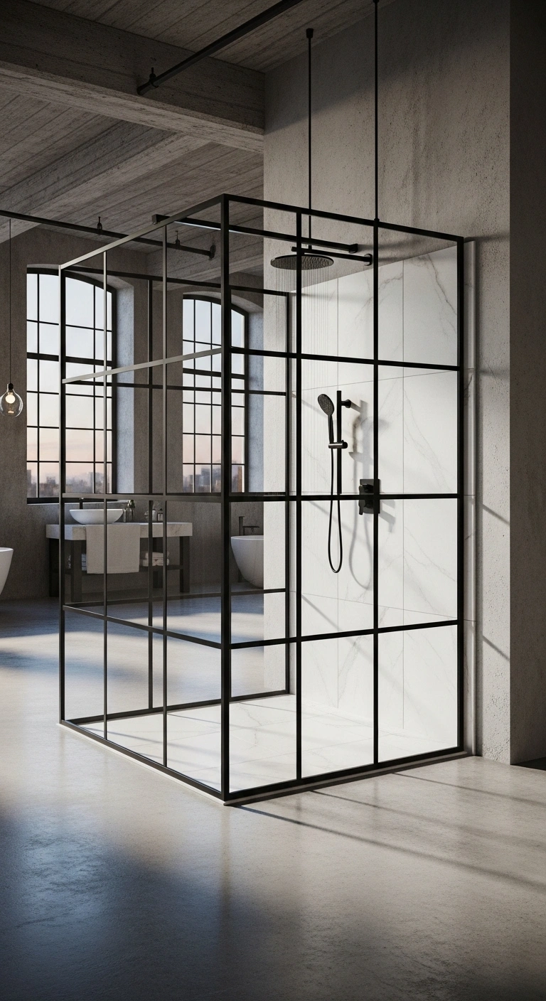 A glass shower with thin black trim creates a modern grid effect. The clean lines add structure without blocking light. Imagine white marble tiles behind a clear glass panel outlined in black metal. The look feels contemporary and airy. It works beautifully in both small and large bathrooms. The contrast feels sharp but not heavy.