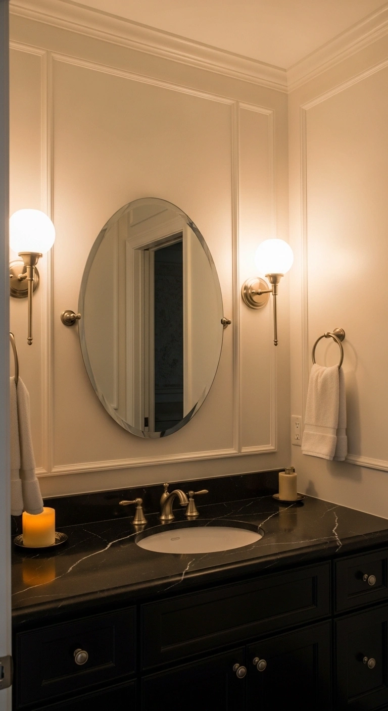 Layer lighting sources for depth. Use wall sconces beside mirrors for even facial lighting. Add a small ceiling spotlight over the shower. Install dimmers to control mood throughout the day. Proper lighting keeps the contrast elegant and inviting.