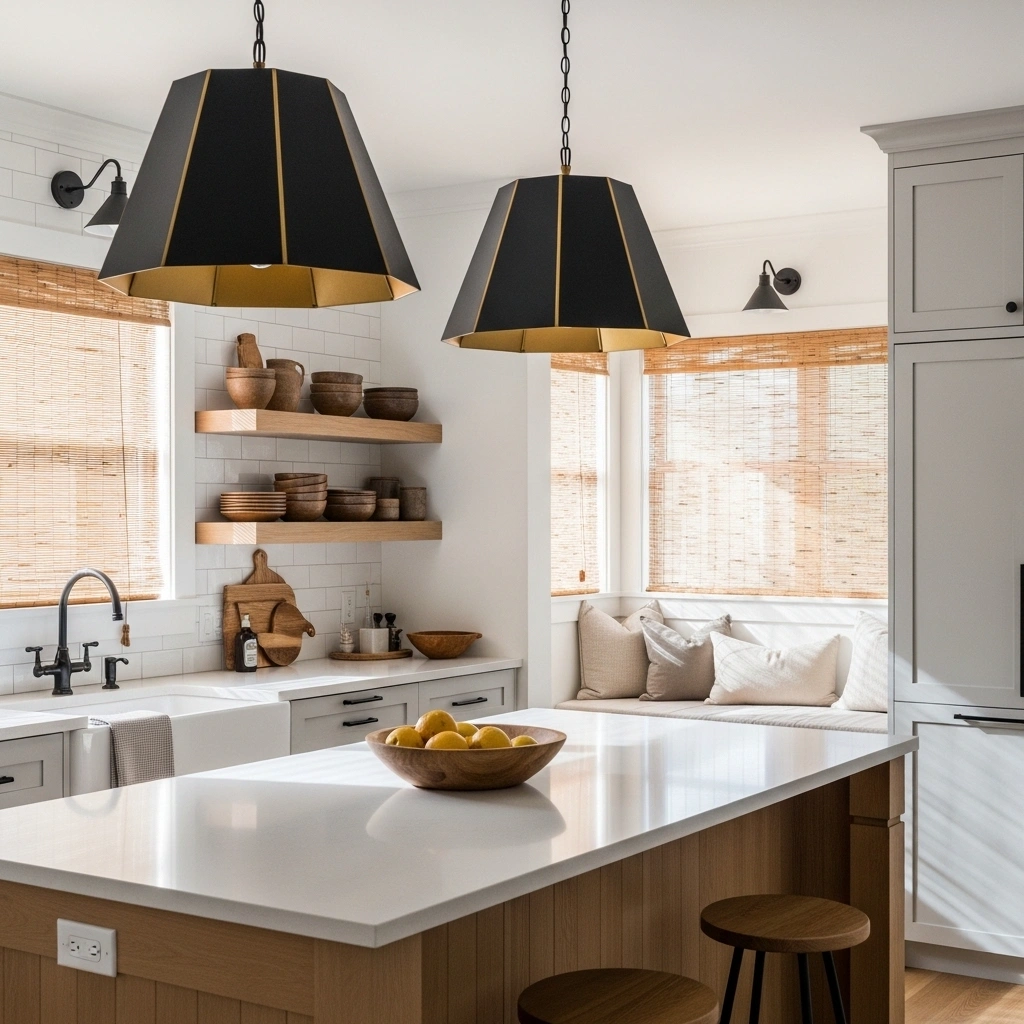 Pendant lights aren’t just functional—they can be art. Oversized globes, geometric frames, or colorful glass shades can define zones and create a focal point above islands or dining areas. Paired with neutral tones or subtle textures, statement lighting brings modern drama and personality to the kitchen space.