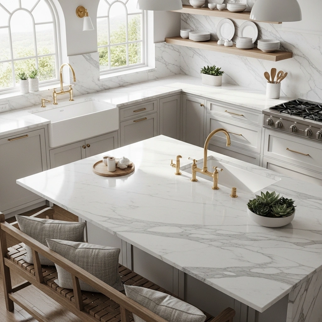 A marble countertop instantly elevates an open kitchen, giving it a timeless and luxurious feel. White or light gray marble with subtle veining complements neutral cabinetry and soft metallic accents. Combined with natural light, the surface reflects brightness and adds a sense of spaciousness. A few carefully chosen décor pieces, like glass jars or wooden cutting boards, bring warmth and texture without taking away from the marble’s beauty.
