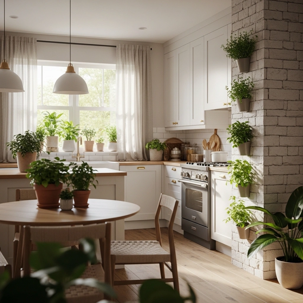 Apply this by choosing easy-care plants suited to kitchen light levels. Herb planters can double as cooking ingredients, while trailing plants soften shelves and islands. Keep pots simple and uniform in color to maintain a modern aesthetic, and vary heights to add depth.