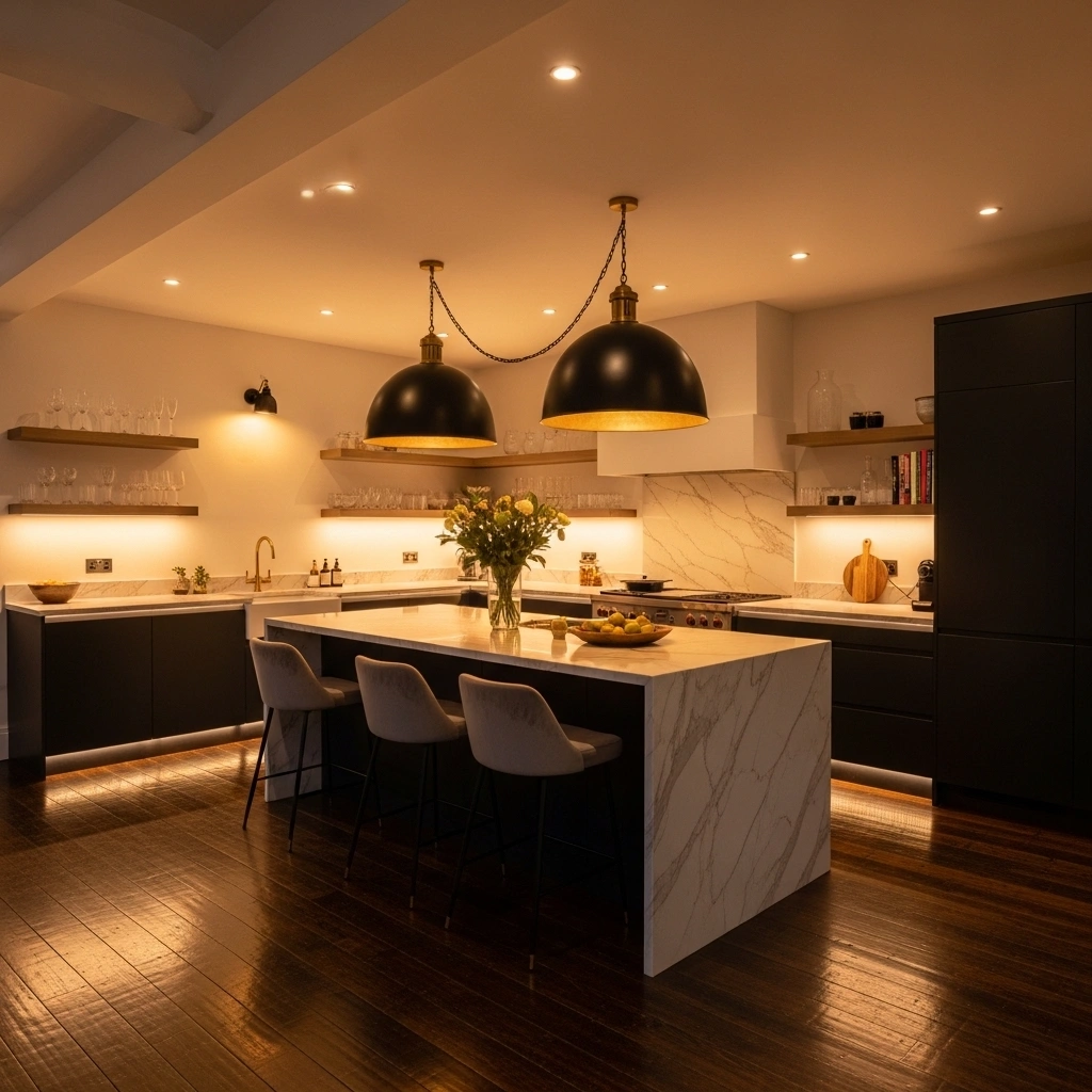 Combining ambient, task, and accent lighting transforms an open kitchen’s mood. Recessed ceiling lights provide overall illumination, pendant lights highlight islands, and under-cabinet strips brighten work surfaces. This layered approach adds depth and functionality while enhancing the space’s visual appeal.