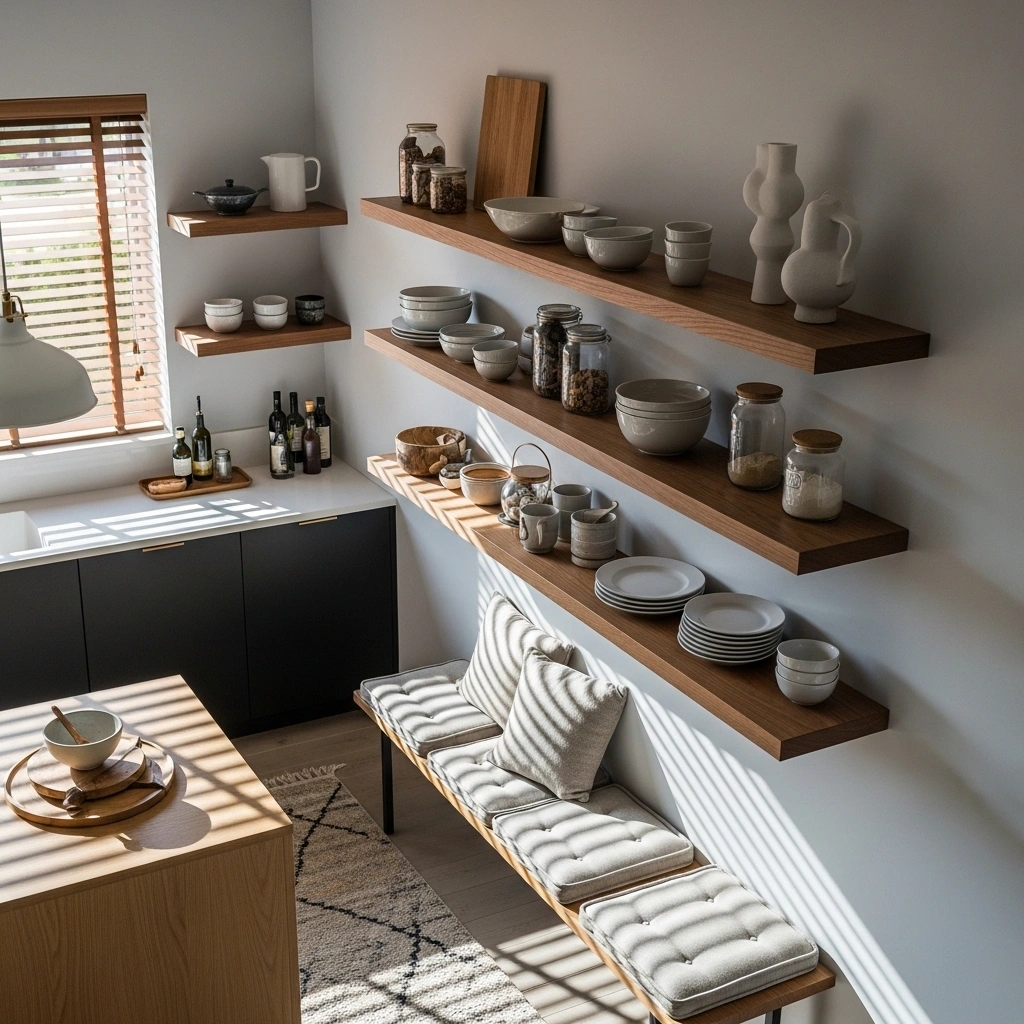 Open shelving offers display opportunities while keeping the space airy. Use wood or metal shelves to showcase ceramics, glassware, or cookbooks. The shelves act as décor and storage, creating a casual yet curated aesthetic that feels contemporary and lived-in.