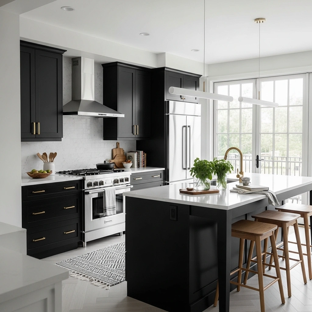 To bring this look home, focus on clean lines and intentional contrast. Install black cabinetry on the lower half and white on the upper. Use integrated lighting under shelves to highlight the countertops. A black-and-white rug or patterned tiles can add subtle texture, and keeping open shelving minimal ensures the kitchen stays airy and uncluttered.