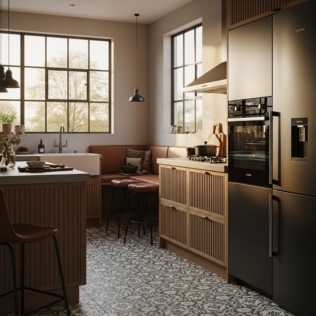 Apply texture sparingly to maintain balance. Fluted cabinet fronts paired with smooth countertops, or patterned tiles with plain walls, create contrast without clutter. Use natural fabrics, stone, or wood textures to maintain a warm, approachable modern aesthetic.
