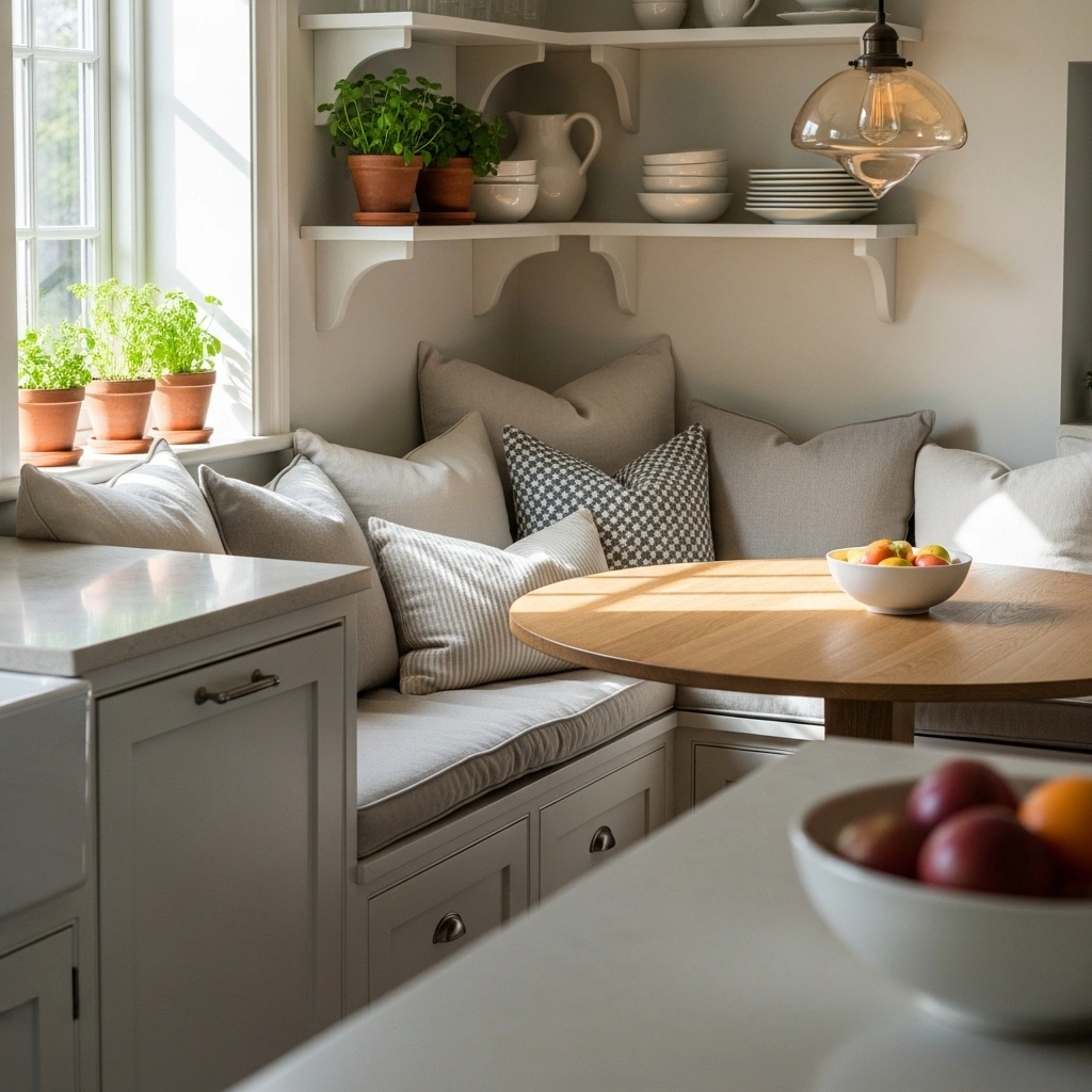 To create a nook, optimize corners or unused spaces. Incorporate soft seating and layered textiles for comfort. Add pendant lighting or a small wall-mounted shelf for décor. This approach blends modern openness with warmth and usability, giving the kitchen a lived-in, inviting vibe.