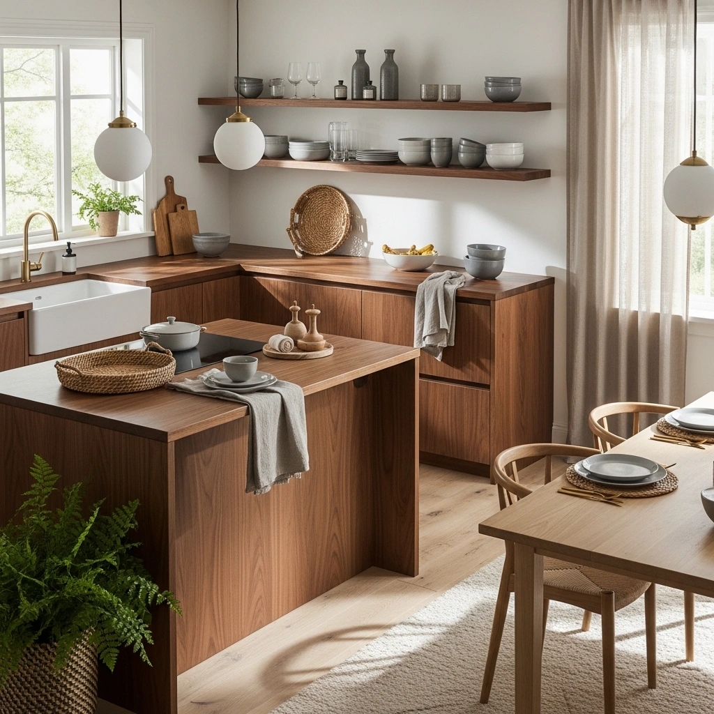 To replicate this style, mix and match wood grains carefully. Use lighter woods for larger surfaces to keep the space bright, and add darker wood accents to frame focal points like islands or breakfast bars. Incorporate simple greenery and ceramic dishes to soften the overall look. Avoid overcrowding open shelves to maintain a clean, airy feel.