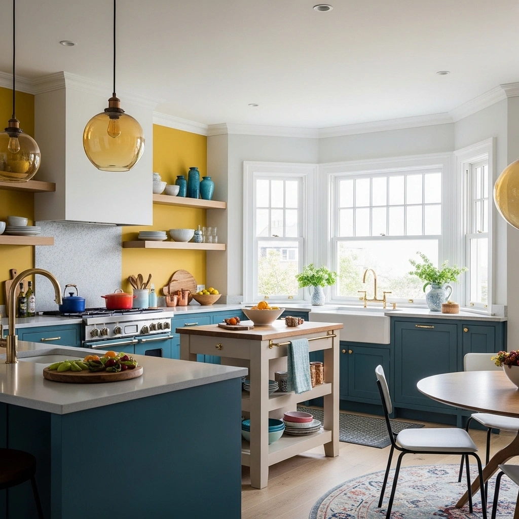 In an open kitchen, color can define zones and inject personality. Imagine a neutral palette of soft grays or whites with pops of deep teal or mustard on cabinets or an accent wall. Brass fixtures, colorful stools, and patterned backsplashes create visual rhythm, while keeping the rest of the space calm ensures it doesn’t feel chaotic. Lighting can enhance the vibrancy, especially with large windows letting in natural light.