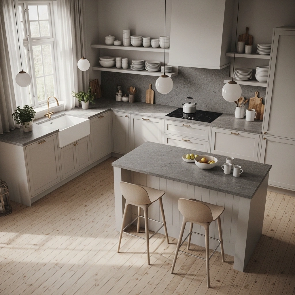 Soft neutrals, clean lines, and minimal clutter define the Scandinavian approach. White cabinets, pale wooden floors, and gentle gray accents create a calm, airy space. Natural light is essential, complemented by understated pendant lighting. Simple yet functional furniture keeps the focus on usability while maintaining a modern aesthetic.