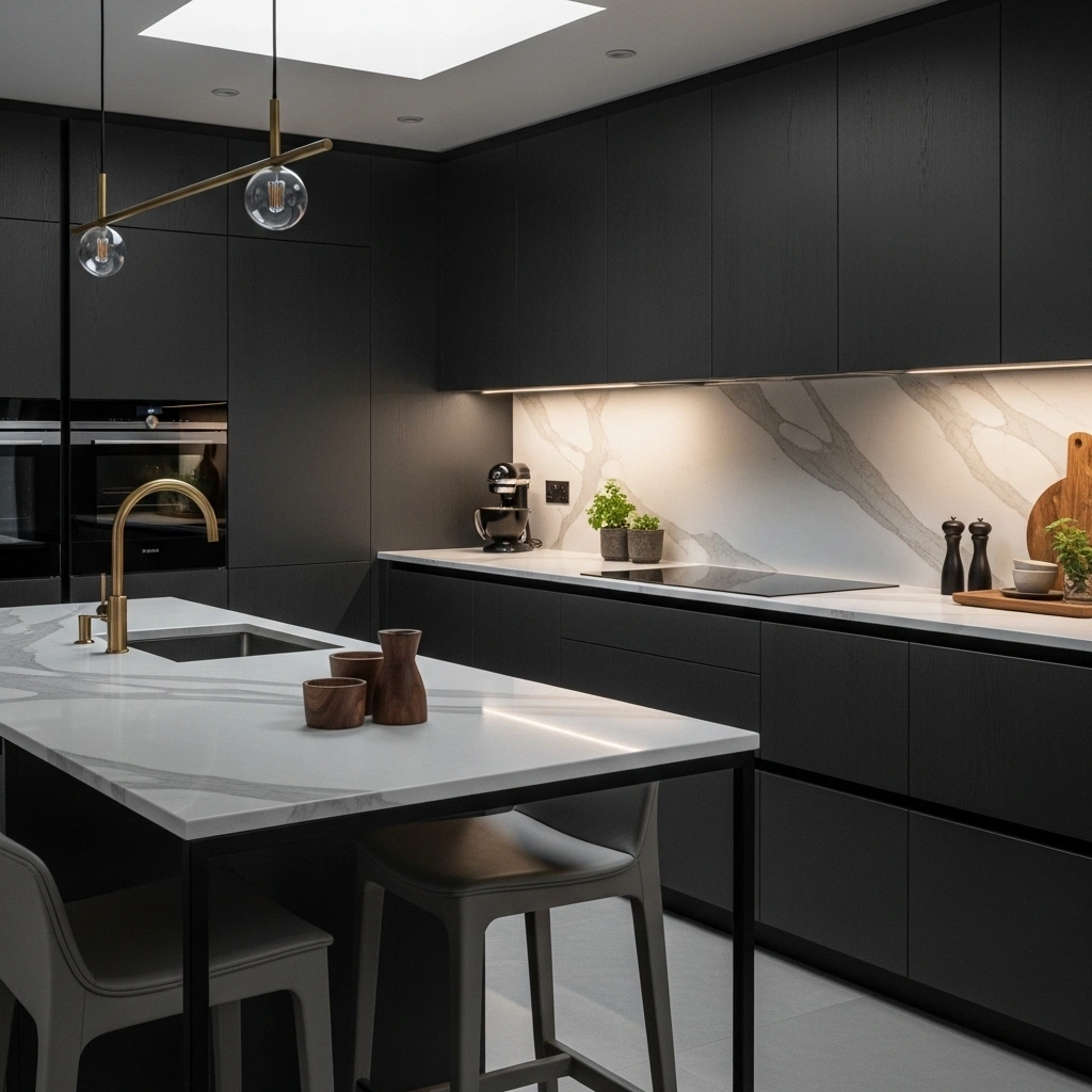 In practice, balance dark matte cabinets with lighter floors or countertops to prevent the space from feeling heavy. Use minimal hardware or integrated handles to maintain smooth lines. Accessories like wooden cutting boards, metallic bowls, or glass jars add visual depth without cluttering the design.