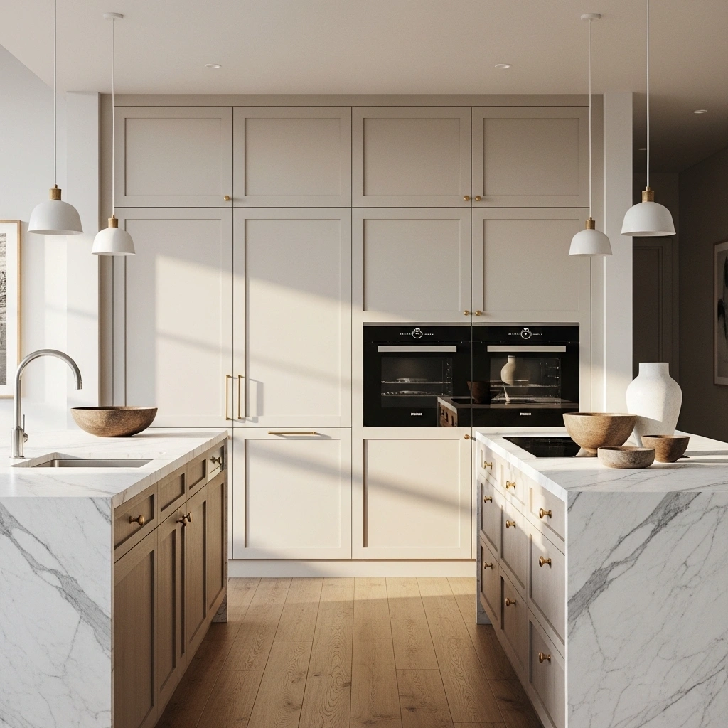 To apply this at home, choose marble or marble-look quartz for durability and ease of maintenance. Pair it with soft matte cabinets to highlight the stone’s shine. Keep accessories minimal and use pendant lighting to accentuate natural veining, making your kitchen feel elegant yet functional.