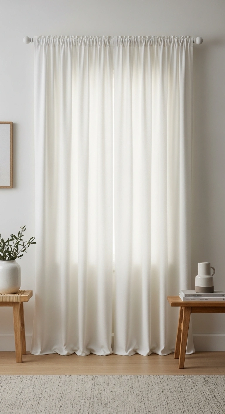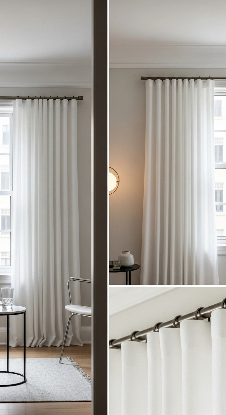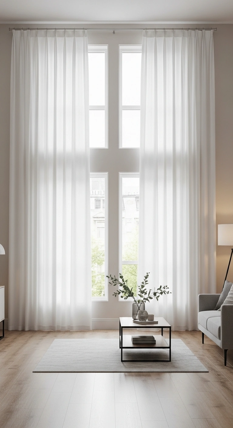 Use full-length white curtains that extend from ceiling to floor for maximum impact. Keep the fabric smooth and flowing to maintain a clean line.
