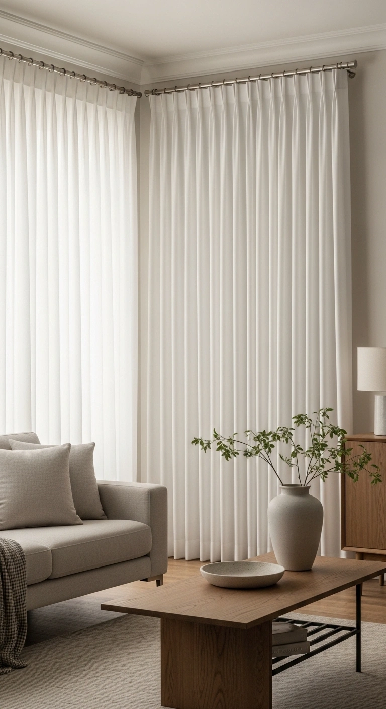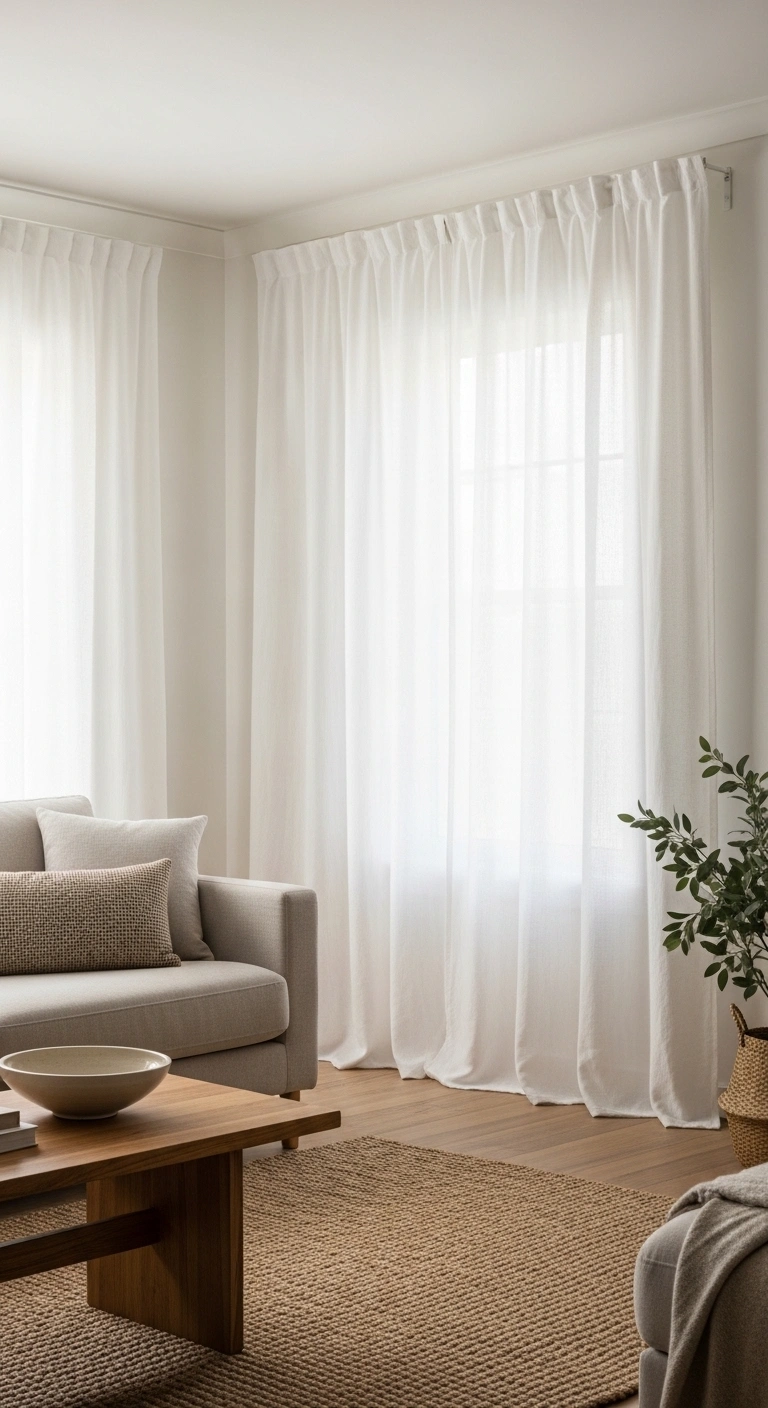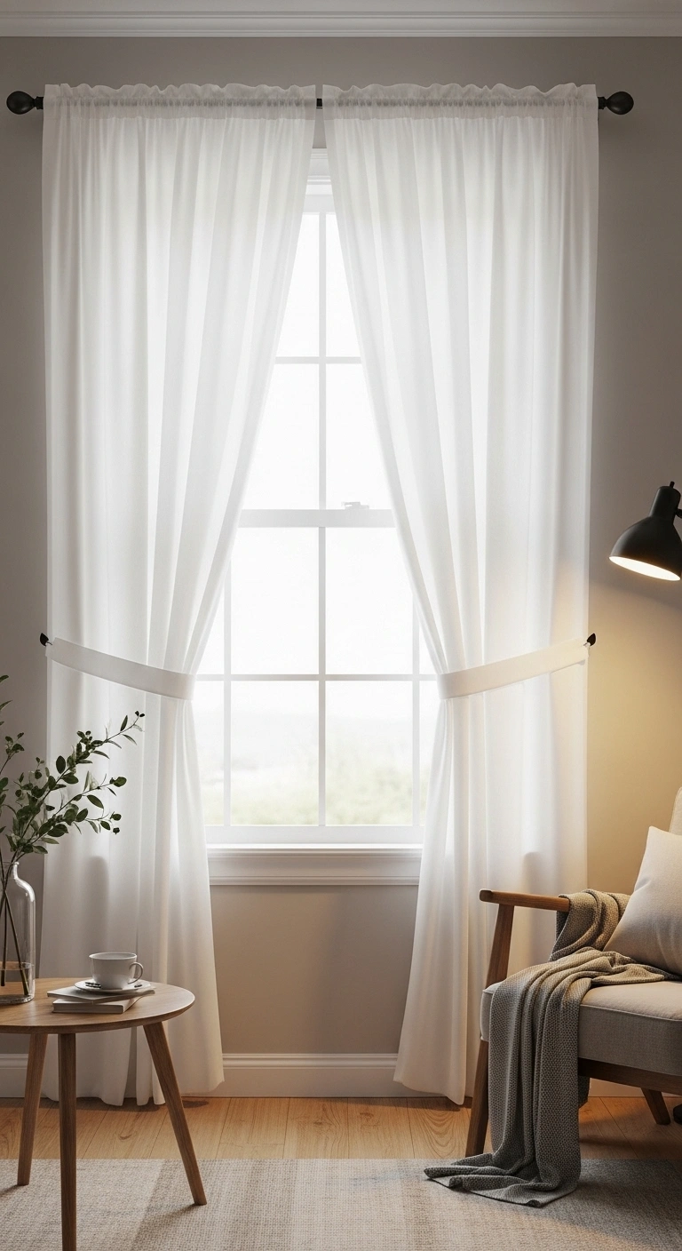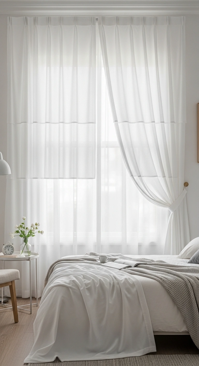 Use full-length white curtains that extend from ceiling to floor for maximum impact. Keep the fabric smooth and flowing to maintain a clean line.