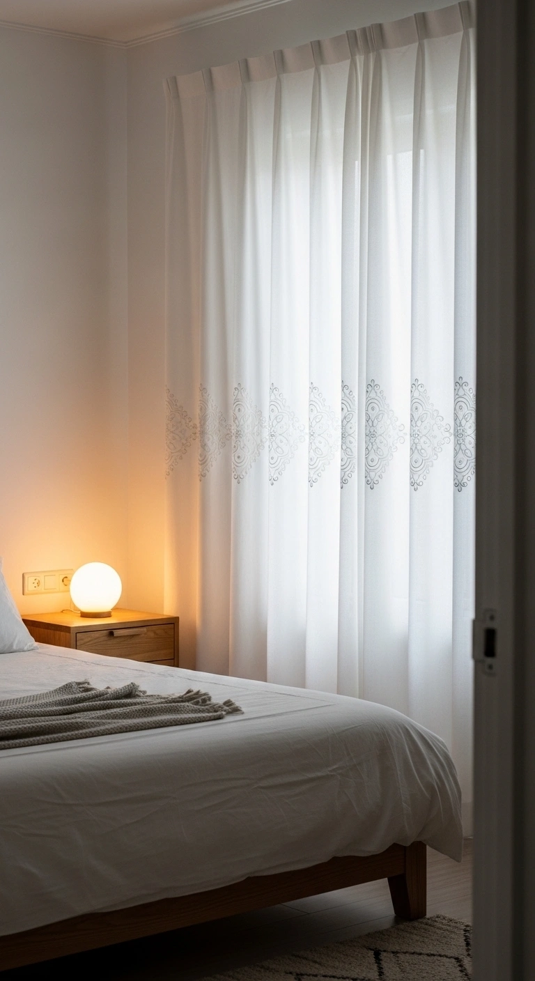 White curtains with subtle embroidery add a delicate layer of texture without overwhelming the space. Small stitched patterns or fine detailing create visual interest while keeping the overall look light and elegant.