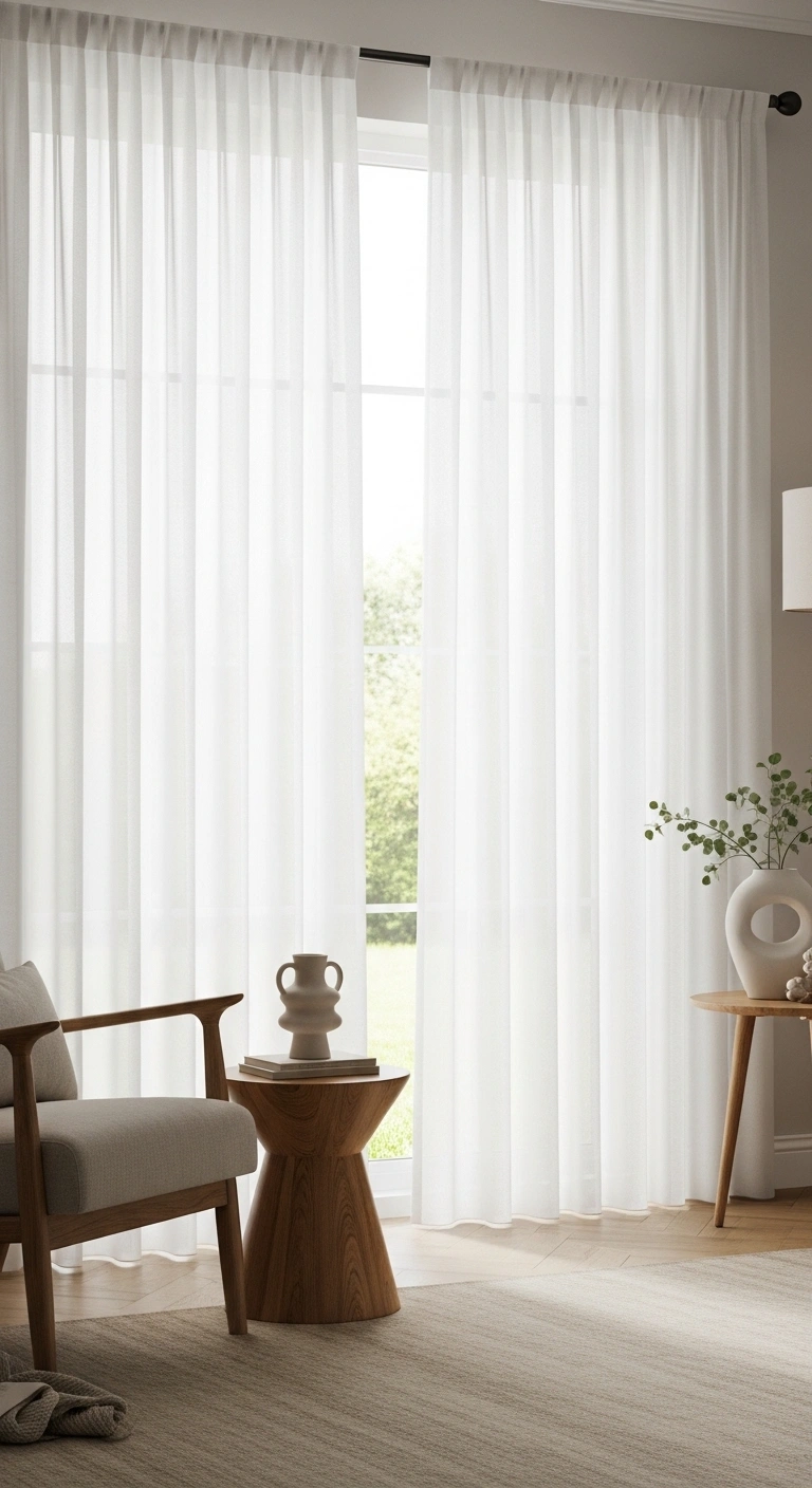 Choose lightweight voile or chiffon for a smooth, airy texture. Hang the curtains slightly above the window frame to make the room feel taller. Let them fall just to the floor for a clean finish. Pair them with light wood furniture or pale flooring to enhance brightness.