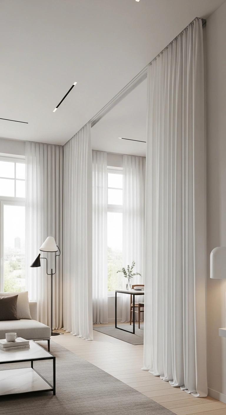 Ceiling-mounted curtain tracks create a seamless and modern look. By hiding the hardware, the curtains appear to fall directly from the ceiling, making the room feel taller and more open.