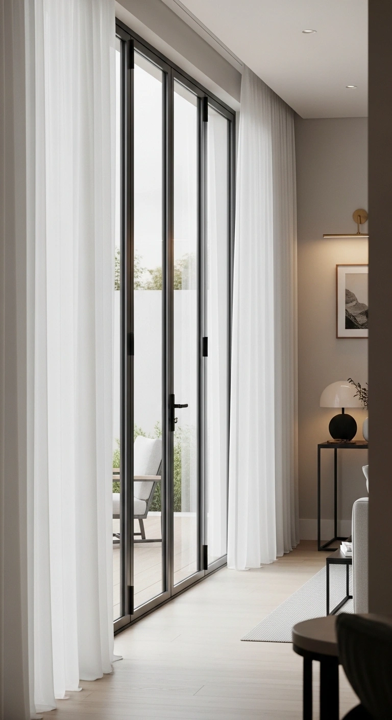 White curtains work beautifully with glass doors by softening the hard edges and adding flow to the space. They help connect indoor and outdoor areas while maintaining privacy when needed.