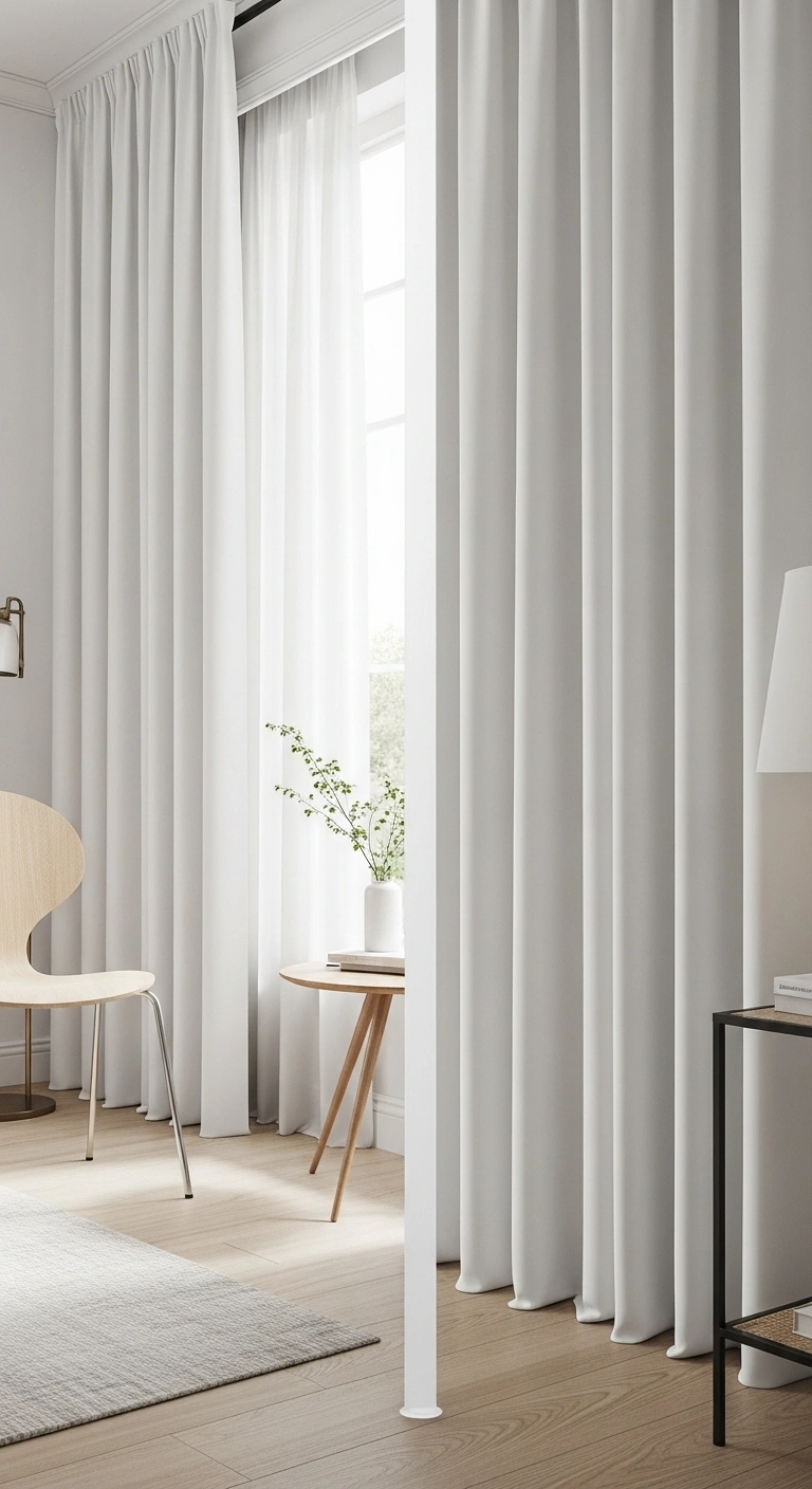 Use a double rod system to keep both layers easy to manage. During the day, keep the blackout panel pushed back and let the outer curtain flow freely. At night, close both layers for full privacy and darkness.