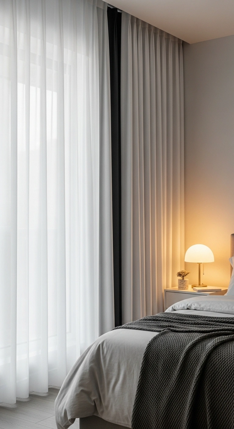 Layered curtains give you flexibility while keeping the design clean. A sheer or light white curtain on the outside allows daylight in, while a hidden blackout layer inside blocks light when needed.