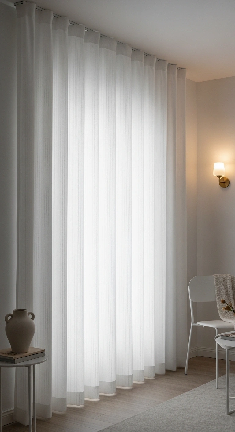 Curtains with fine vertical textures add depth without making the space feel busy. Thin woven lines or soft pleats draw the eye upward, making ceilings feel higher and rooms appear more spacious.