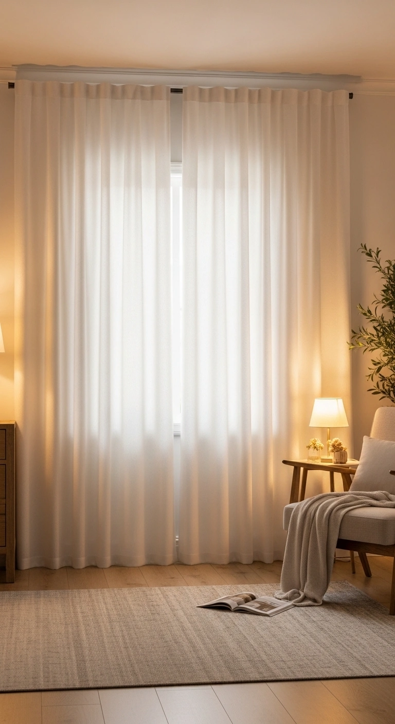 Pair these curtains with warm light bulbs and natural materials like wood or woven decor. This helps balance the room and creates a cozy yet clean look.