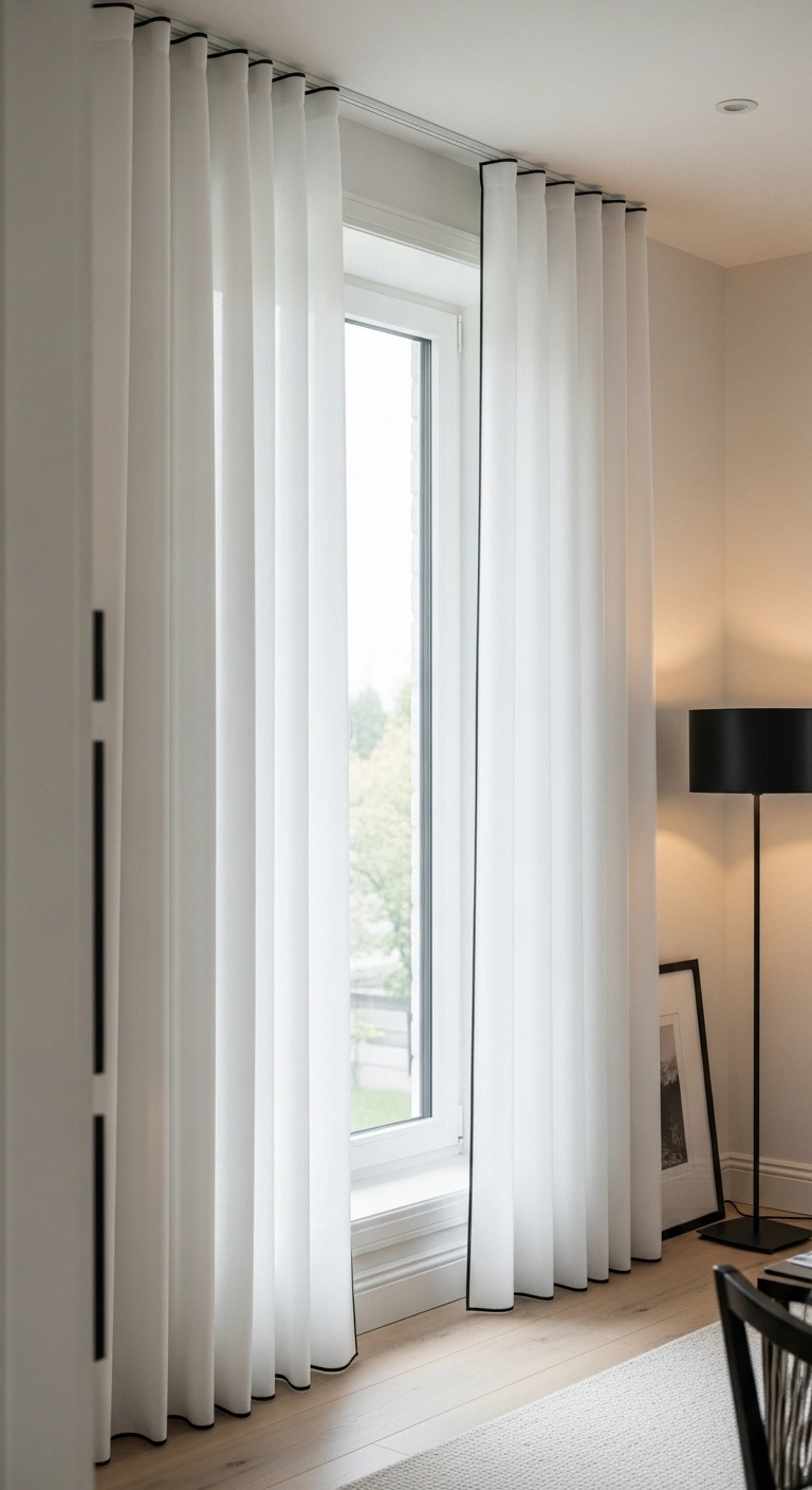 Adding a thin black border to white curtains creates a sharp, modern contrast. It frames the window and adds structure without overpowering the space.