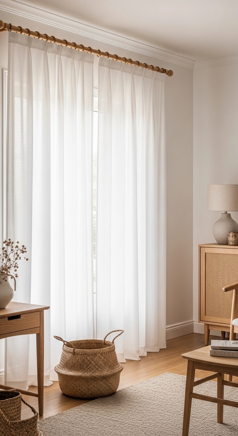 Pairing white curtains with wooden rods adds warmth and contrast in a subtle way. The natural grain of the wood breaks the monotony of white while keeping the overall look soft and balanced.