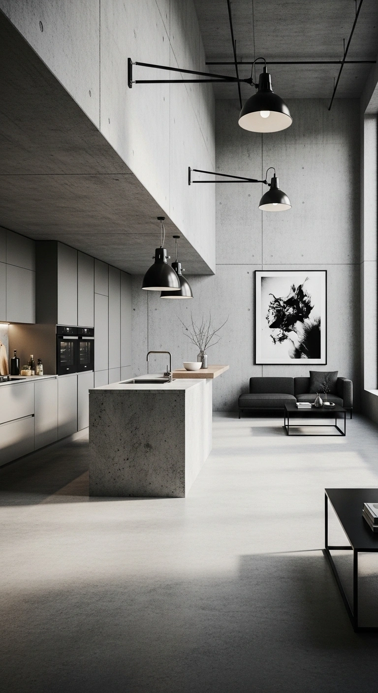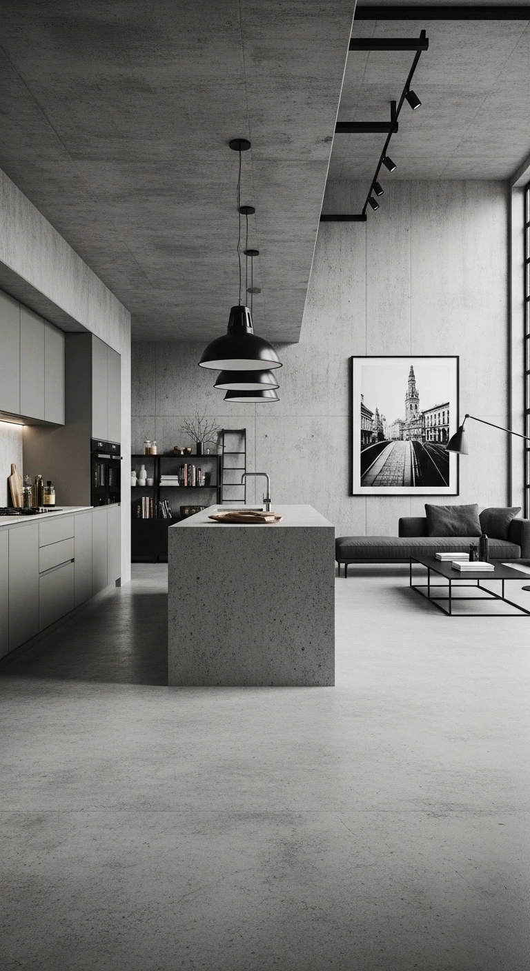 A concrete minimalist open kitchen living room combo brings a modern, architectural feel into a small space. The kitchen uses smooth concrete countertops with matte gray cabinetry and integrated appliances for a seamless appearance. A narrow island doubles as a cooking and dining surface with clean straight lines. Industrial pendant lights hang above, creating soft shadows across the textured surfaces. The living room features a low-profile gray sofa with sharp geometric edges to match the kitchen design. A black metal coffee table and neutral rug maintain the minimalist aesthetic. This setup feels strong, modern, and visually structured.