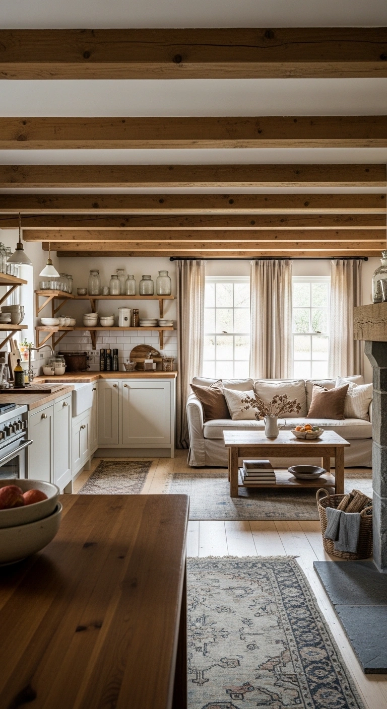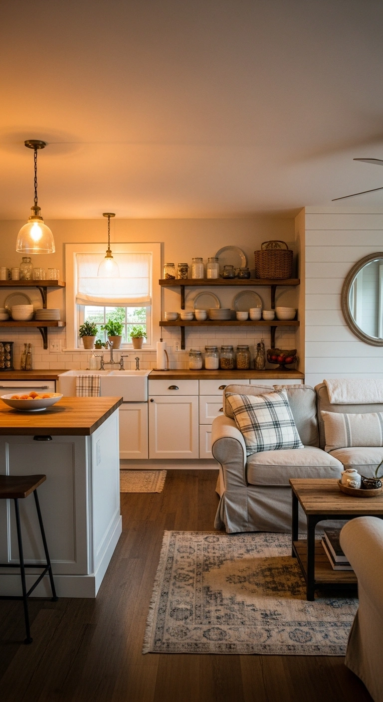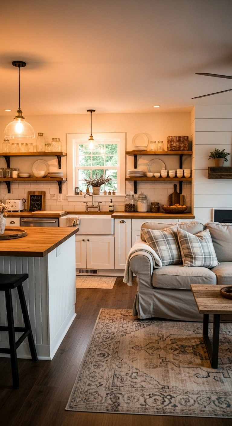 A rustic farmhouse open kitchen living room combo brings warmth and charm into small spaces using natural textures. The kitchen features white shaker cabinets paired with a wooden countertop and a farmhouse-style sink. Open wooden shelves display ceramic dishes, mason jars, and woven baskets for a homely feel. The living room includes a soft beige sofa layered with plaid or linen cushions for added coziness. A reclaimed wood coffee table sits at the center, adding character and warmth. Warm pendant lighting above the kitchen enhances the rustic mood. The space feels inviting, comfortable, and full of personality.
