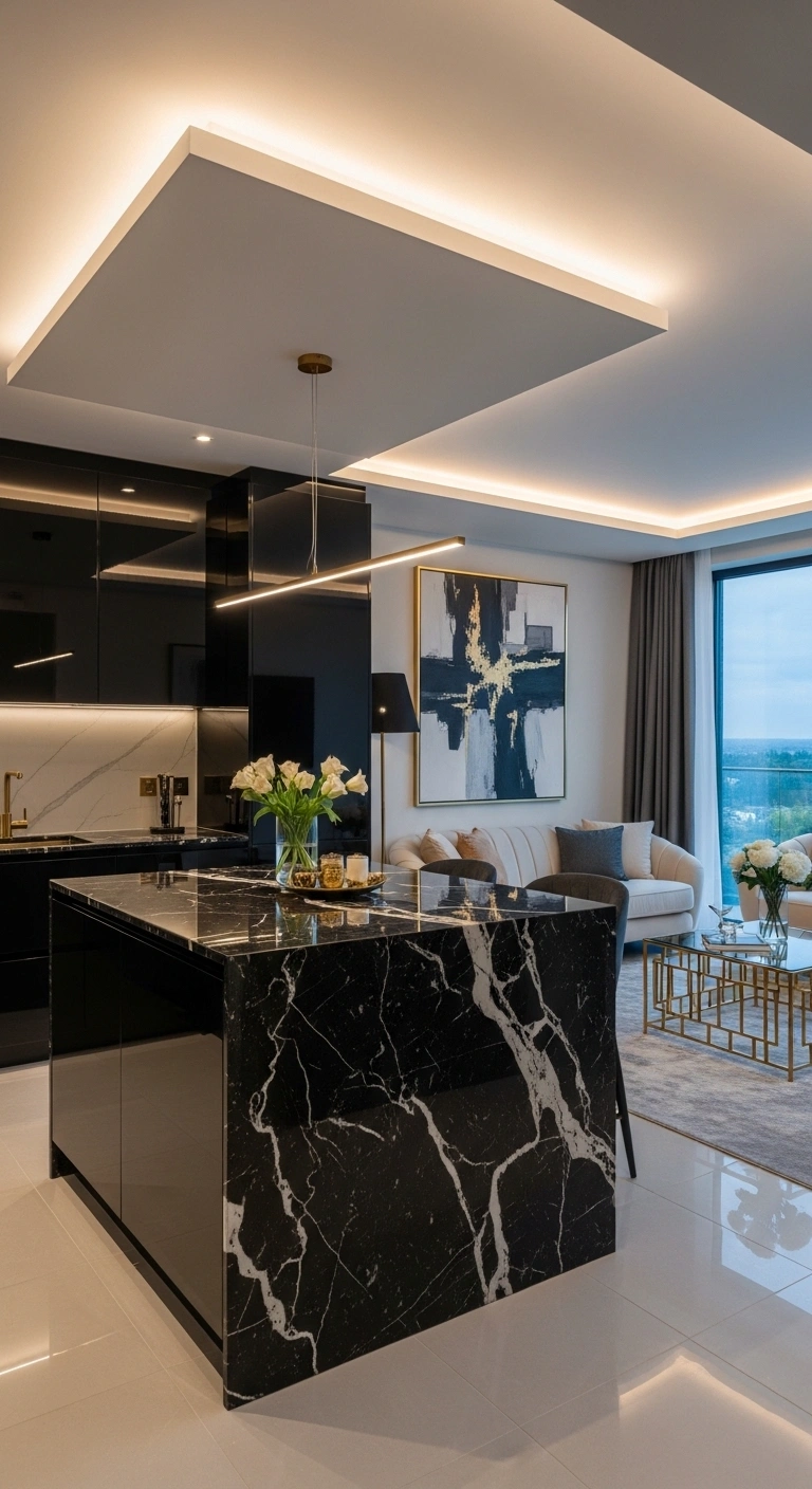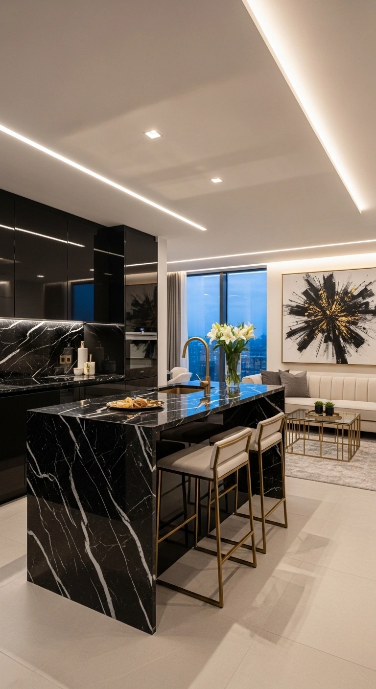 A black marble open kitchen living room combo creates a high-end luxury atmosphere in a compact space. The kitchen features black marble countertops with white veining paired with glossy dark cabinets and gold hardware. A sleek waterfall island becomes the centerpiece, adding elegance and functionality. Warm hidden lighting beneath cabinets enhances the richness of the marble surface. The living room includes a velvet cream sofa that softens the dark kitchen tones. A gold-accent coffee table and soft neutral rug balance the dramatic contrast. This design feels luxurious, bold, and refined.
