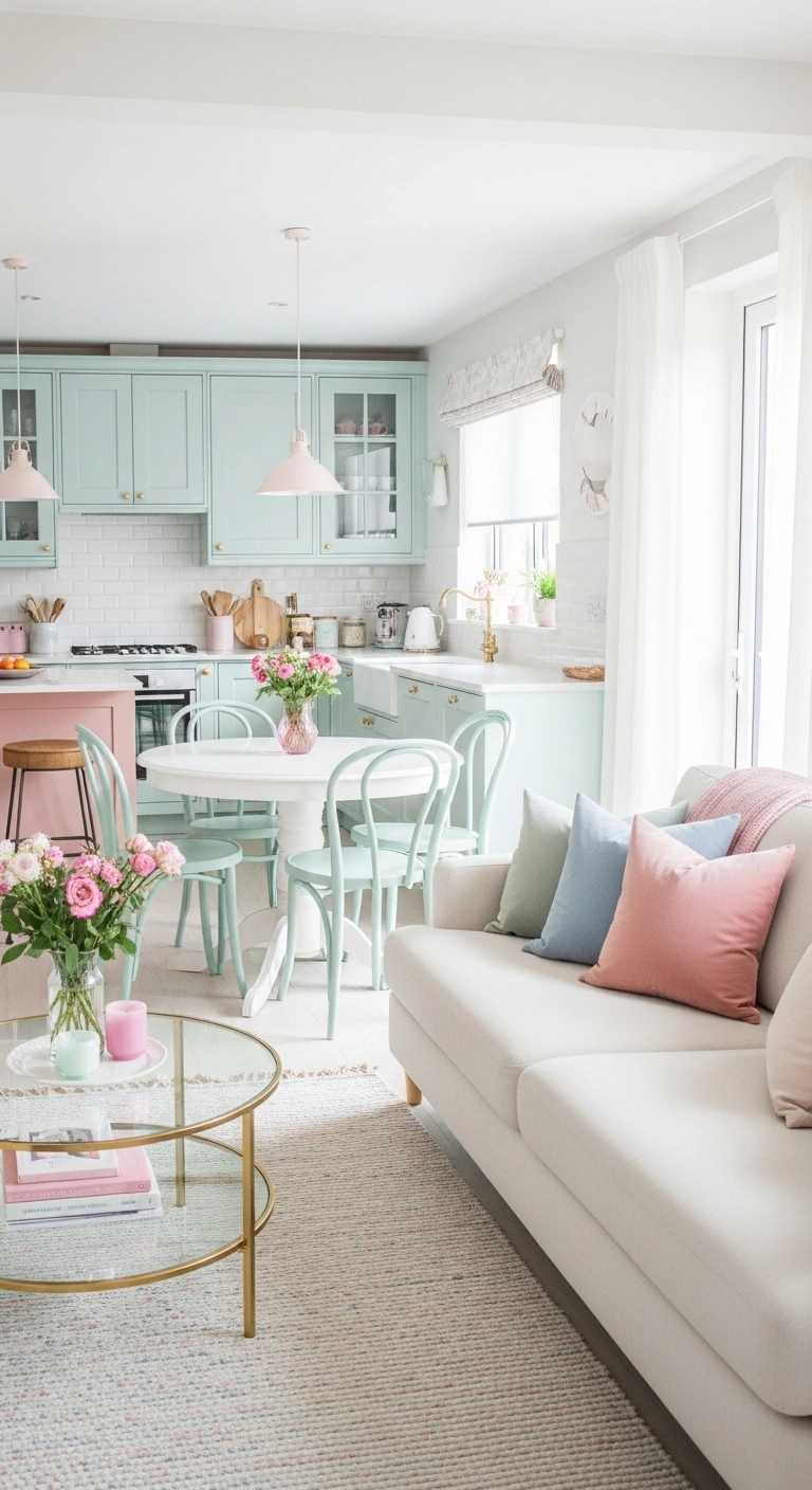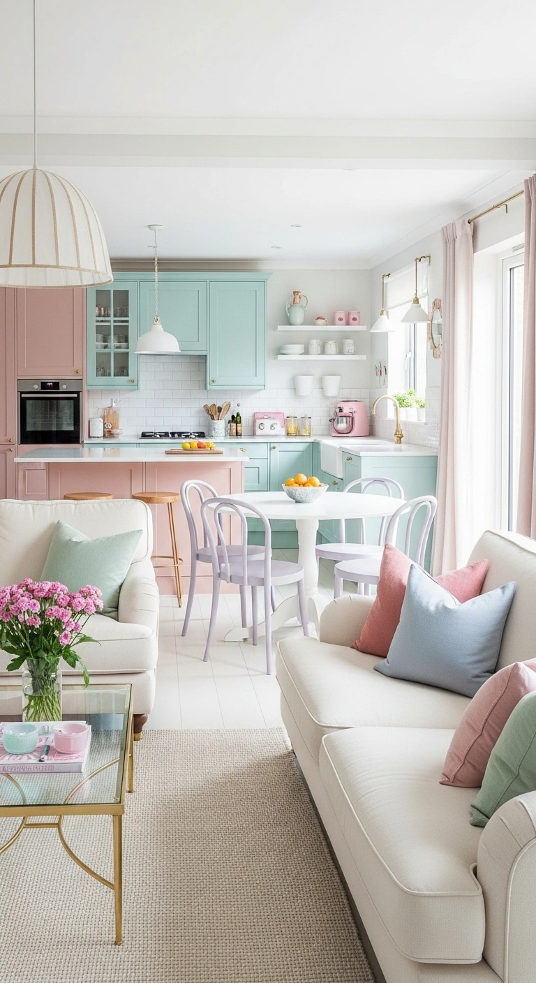 A soft pastel open kitchen living room combo creates a light, cheerful atmosphere perfect for small spaces. The kitchen uses pale blush, mint, or powder blue cabinets paired with white countertops for a gentle color palette. Small brass or chrome details add subtle shine without overpowering the softness. The living room continues the pastel theme with a light cream sofa and pastel cushions in soft coordinated tones. A round glass coffee table keeps the space visually light and airy. Natural light enhances the pastel shades throughout the day. This design feels fresh, playful, and visually uplifting.