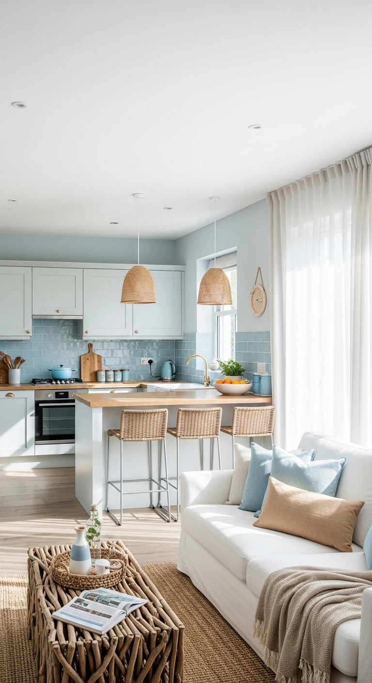 A coastal open kitchen living room combo creates a light and breezy atmosphere ideal for small spaces. The kitchen uses white cabinetry, light blue backsplash tiles, and natural wood countertops for a relaxed seaside feel. The living area features a white linen sofa, soft blue cushions, and a woven jute rug. Large sheer curtains allow sunlight to fill the entire space, making it feel open and airy. Rattan pendant lights and driftwood-style décor connect both zones seamlessly. The overall palette stays light and fresh to enhance openness. This design feels calm, airy, and perfect for relaxed everyday living.