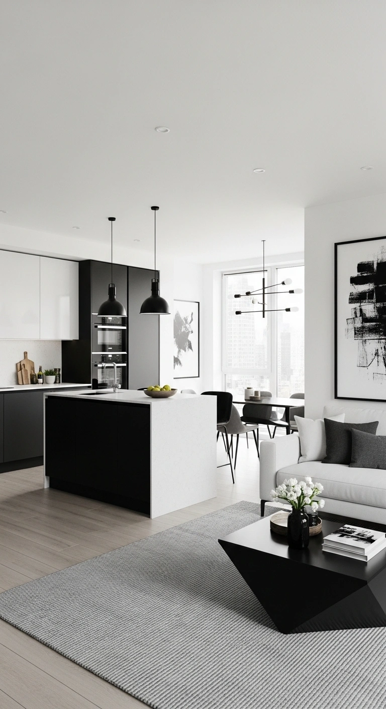A black and white open kitchen living room design creates a modern, high-contrast space that feels clean and visually striking. The kitchen uses matte black cabinets with white quartz countertops for a sharp, minimal look. The living area balances this with a white sofa, black accent chairs, and a simple geometric rug. Large floor-to-ceiling windows keep the space bright so the darker elements do not feel heavy. A slim black dining table acts as a subtle transition between the two zones. Warm hidden lighting under kitchen cabinets softens the contrast in the evening. This design works especially well in small spaces because the limited color palette keeps everything visually organized and cohesive.