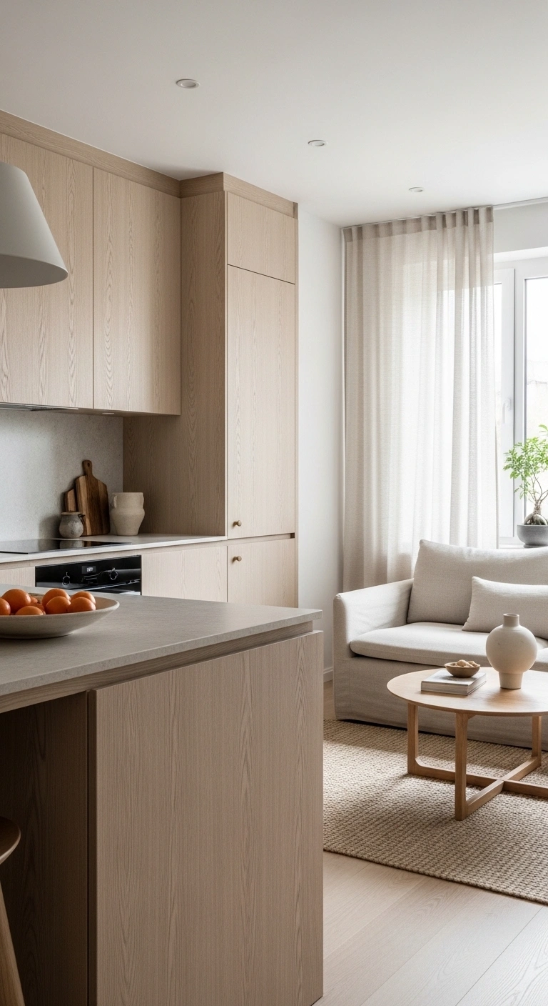 8. Japandi Open Kitchen with Calm Minimal Living Room