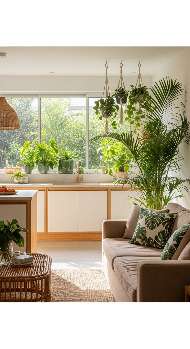 A boho open kitchen living room combo brings warmth and personality into a small space using layered textures and earthy tones. The kitchen features open wooden shelving with ceramic dishes, hanging plants, and soft beige tiles for a natural feel. The living room includes a low linen sofa, patterned cushions in muted terracotta and olive, and a woven jute rug. Rattan pendant lights tie both spaces together with soft warm lighting. A small wooden dining table placed between the kitchen and sofa acts as a natural divider. Macramé wall hangings and indoor plants add softness without overcrowding. This design feels relaxed, creative, and full of life while still being practical for compact living.