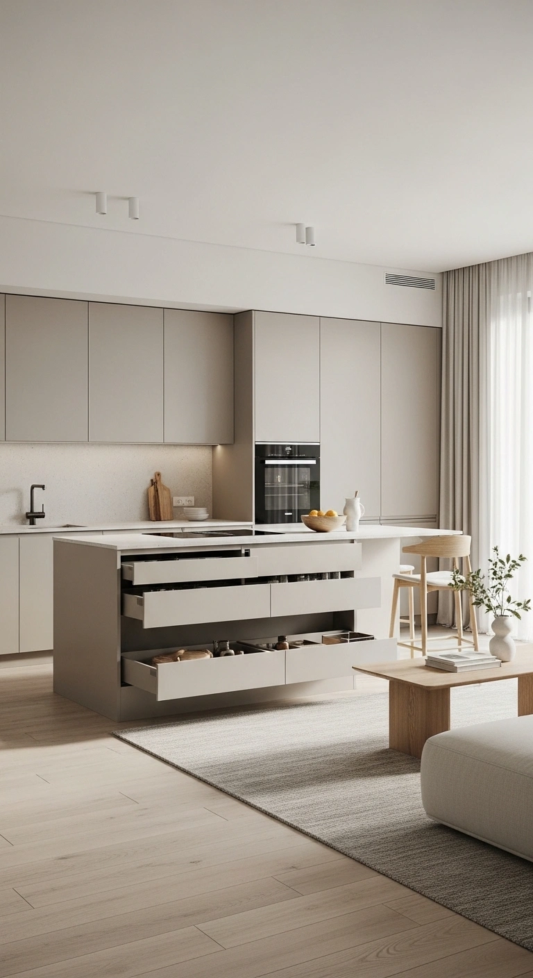A hidden storage open kitchen and living room combo is perfect for keeping small spaces clean and visually calm. The kitchen uses handleless cabinets in soft matte white or beige, blending appliances into the wall so nothing feels visually heavy. A compact island sits at the center, doubling as both prep space and dining area with hidden drawers for storage. The living room stays minimal with a low neutral sofa and a floating media unit that hides wires and clutter. Soft under-cabinet lighting adds a warm glow at night and keeps the space feeling cozy. Large light-colored tiles or continuous wood flooring help unify both zones. This layout feels highly functional, organized, and perfect for people who prefer a clutter-free home.