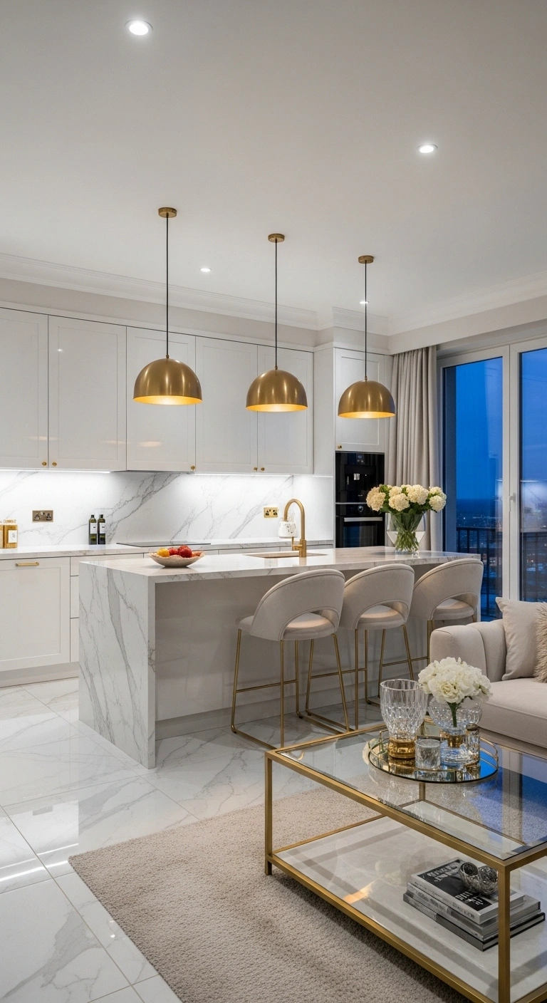 A luxury open kitchen living room combo uses marble and metallic accents to create an elegant small-space design. The kitchen features white marble countertops with soft gray veining, paired with sleek handleless cabinets in soft beige or taupe. The living room includes a plush cream sofa, gold-accent coffee table, and soft textured rug. Hidden lighting under cabinets and behind shelves adds a warm glow in the evening. A compact dining nook with velvet chairs fits neatly between the two zones. The overall palette remains soft and refined for visual harmony. This design feels upscale, polished, and surprisingly spacious.