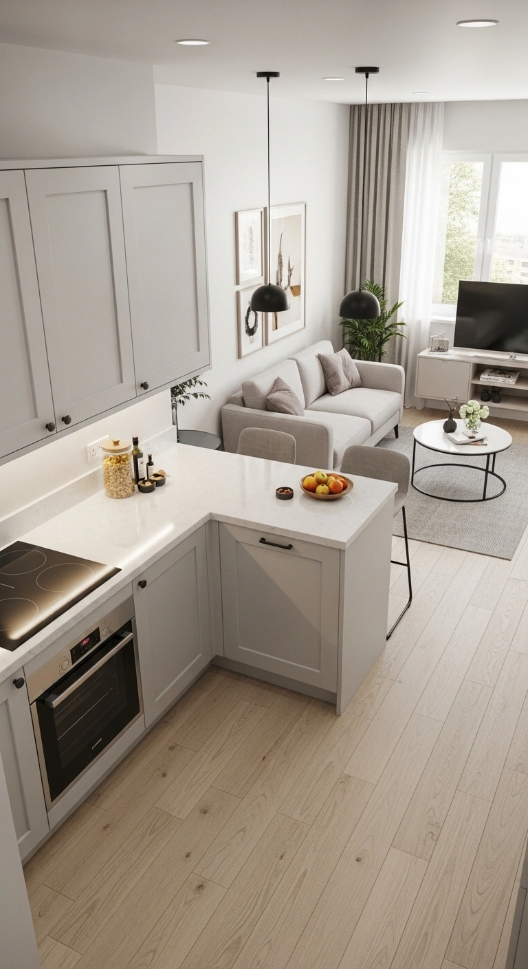 The living zone includes a woven rug and a round wooden coffee table to maintain softness and flow. Wall décor is minimal, often limited to abstract prints in neutral tones or simple line art. Floor lamps with fabric shades create warm ambient lighting during evenings. The kitchen and living room share the same flooring, usually light oak or pale ash wood, which visually expands the space. Hidden storage keeps surfaces clean and uncluttered for a peaceful atmosphere. Indoor plants add small touches of green without overpowering the design. This layout feels calm, functional, and perfectly suited for small cozy homes.
