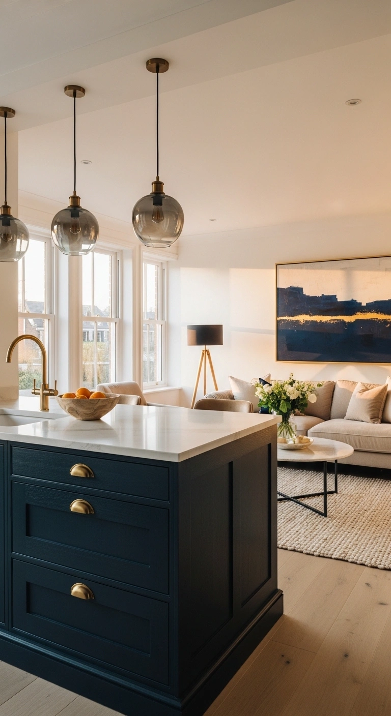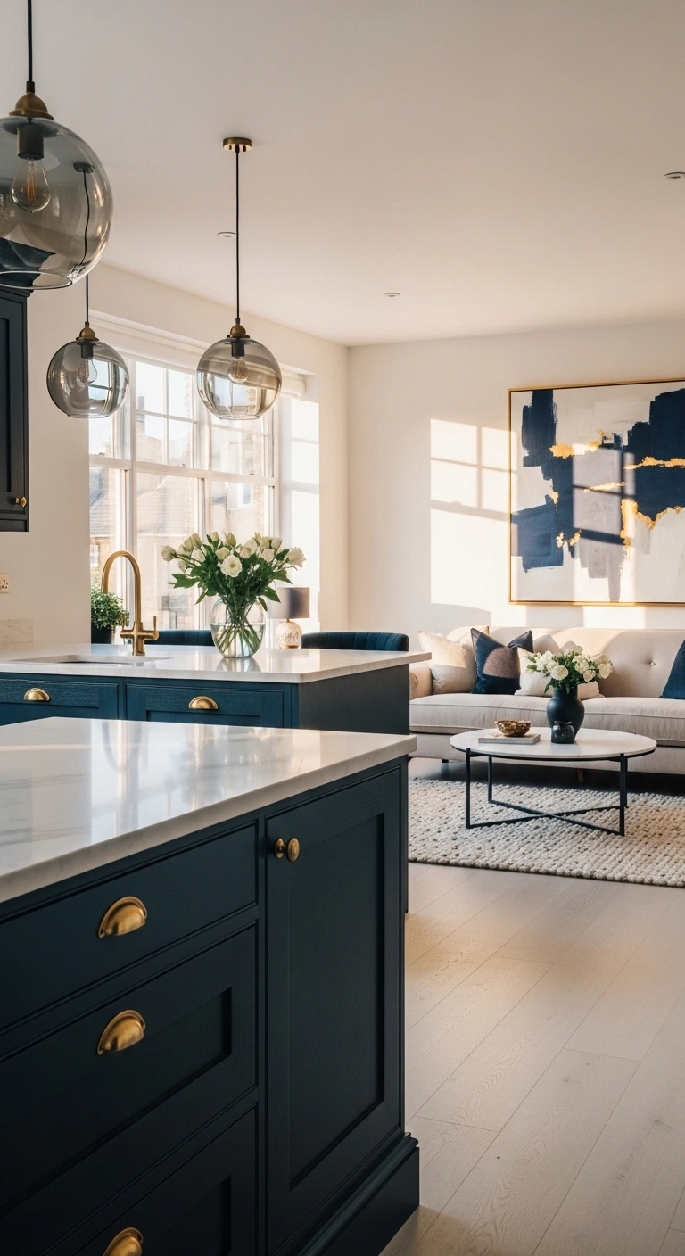 A dark navy open kitchen living room combo creates a bold yet elegant contrast in a small space. The kitchen features deep navy cabinets paired with brass handles and white marble countertops for a luxurious finish. A compact peninsula separates cooking from the living area while maintaining open flow. Warm pendant lighting above the kitchen softens the darker tones and adds a cozy evening glow. The living room uses a light beige sofa to balance the deep color palette and prevent the space from feeling heavy. A soft neutral rug and wooden coffee table help ground the design. This combination feels rich, dramatic, and visually striking without overwhelming the room.