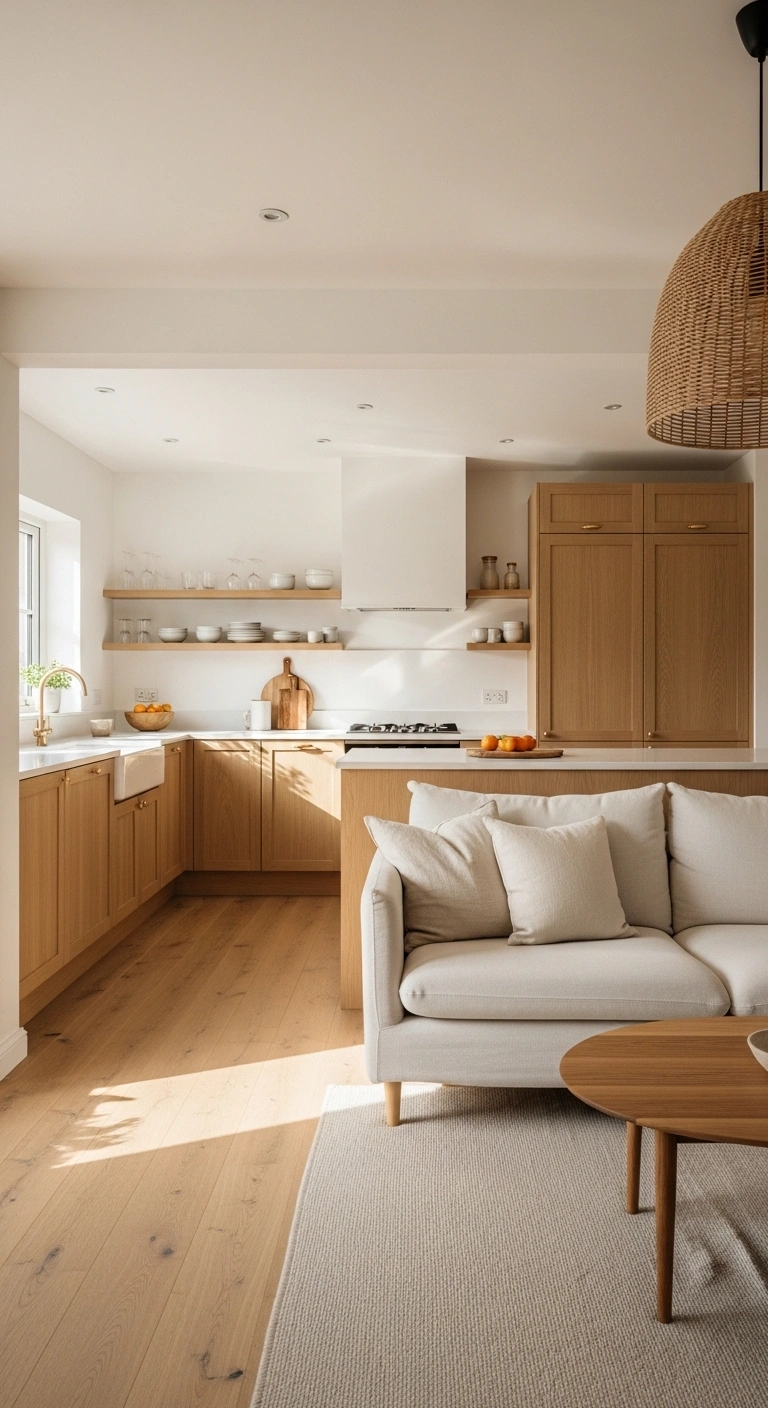 A warm Scandinavian open kitchen living room combo focuses on natural wood textures and soft neutral tones. The kitchen features light oak cabinetry with white quartz countertops and simple black hardware for subtle contrast. Open shelving displays minimal ceramics, glassware, and small green plants for a natural aesthetic. The living room continues the warmth with a cream linen sofa and soft beige cushions layered for comfort. Large windows allow soft daylight to enhance the wood tones throughout the space. A simple wooden dining table sits between both areas, acting as a gentle transition point. Everything feels light, balanced, and naturally cohesive.