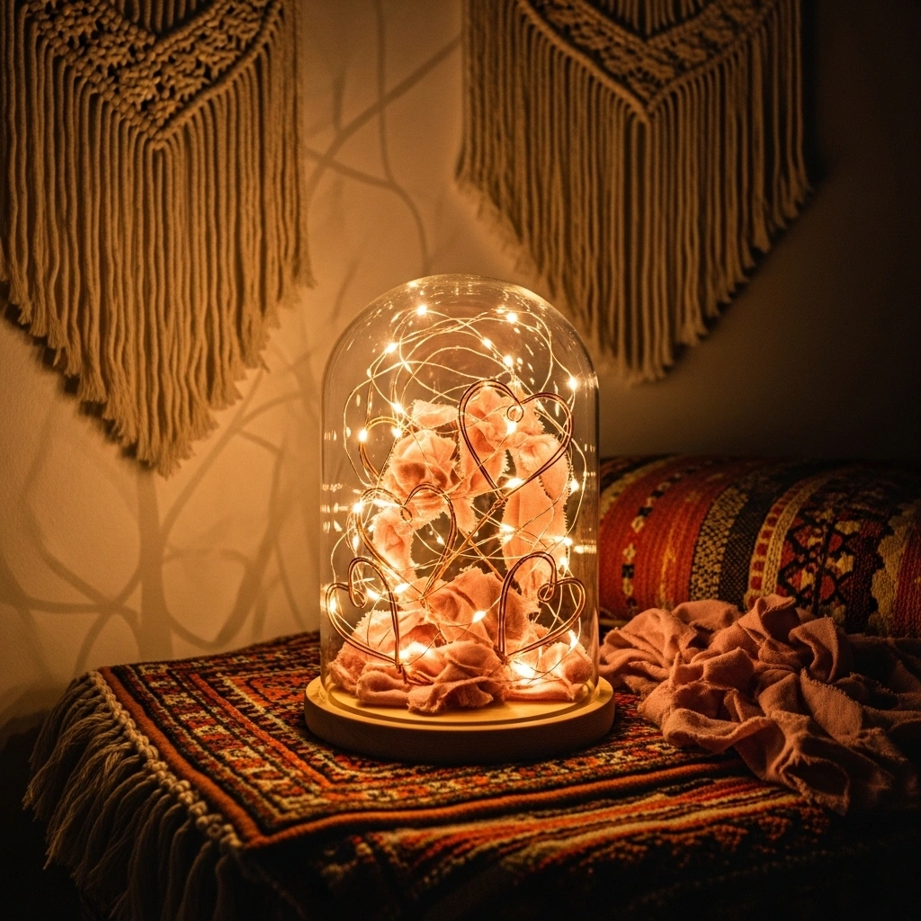 Place fairy lights inside a glass dome with small decorative hearts. The enclosed glow feels magical and intimate. Choose warm white lights for a soft effect. Add faux roses or small love notes inside. The layered elements create depth and interest. This becomes a beautiful night-time accent piece.