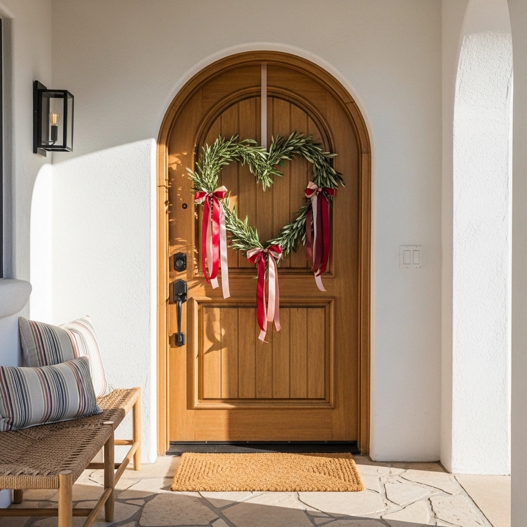 Craft a heart-shaped wreath using twigs or faux florals. Wrap soft blush ribbon around the frame. Add subtle greenery for contrast. The mix of natural and romantic elements feels balanced. Hanging it on your front door sets the tone instantly. It welcomes guests with warmth.