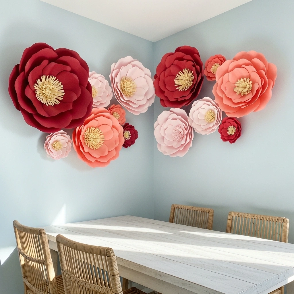 Create oversized paper flowers in blush and ivory tones. Arrange them in a corner wall cluster. The soft petals add depth and romance. This works well behind dining tables or reading nooks. The layered paper creates shadow and texture. It feels festive yet elegant.