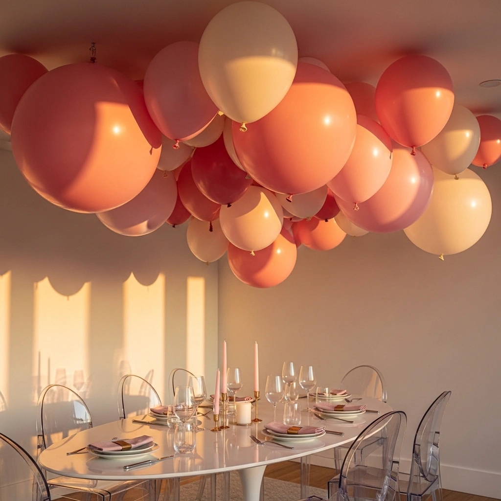 Hang soft pink and cream balloons from the ceiling. Let them float at different heights. Tie sheer ribbons to add movement. The layered heights create a dreamy effect. It transforms a dining area instantly. The look feels playful yet romantic.