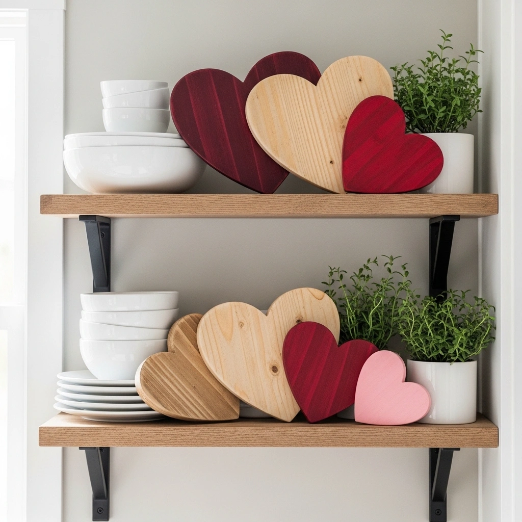Cut small wooden hearts and stain them lightly. Display them on open shelves. The wood grain adds warmth and texture. Mix them with books and small plants. This keeps the look balanced and natural. It feels cozy without being overly themed.