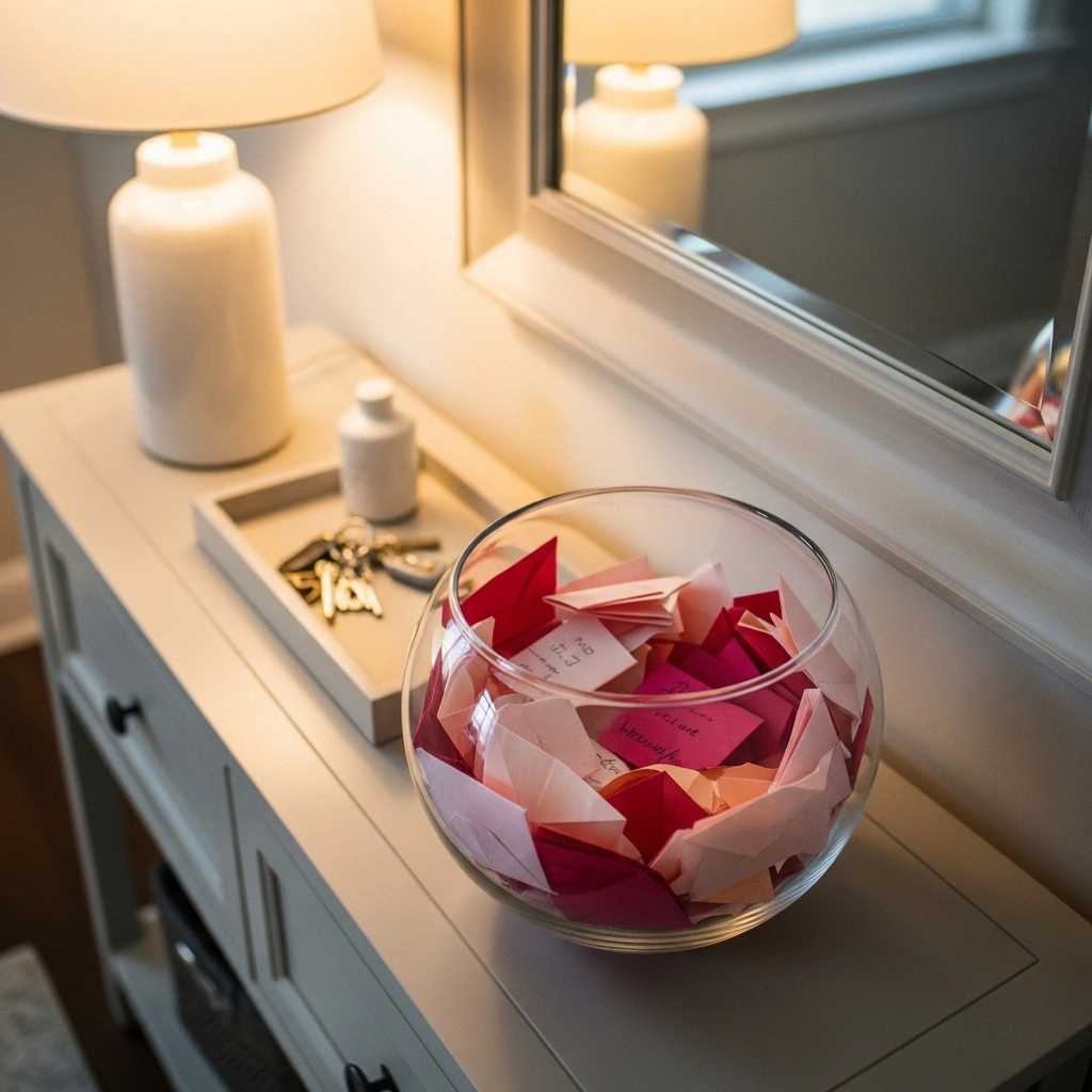 Fill a clear glass bowl with handwritten love notes. Use soft pastel paper for variety. Fold notes into small hearts or simple rolls. The layered paper colors look charming. It creates a personal and meaningful decoration. This works beautifully on entry consoles.