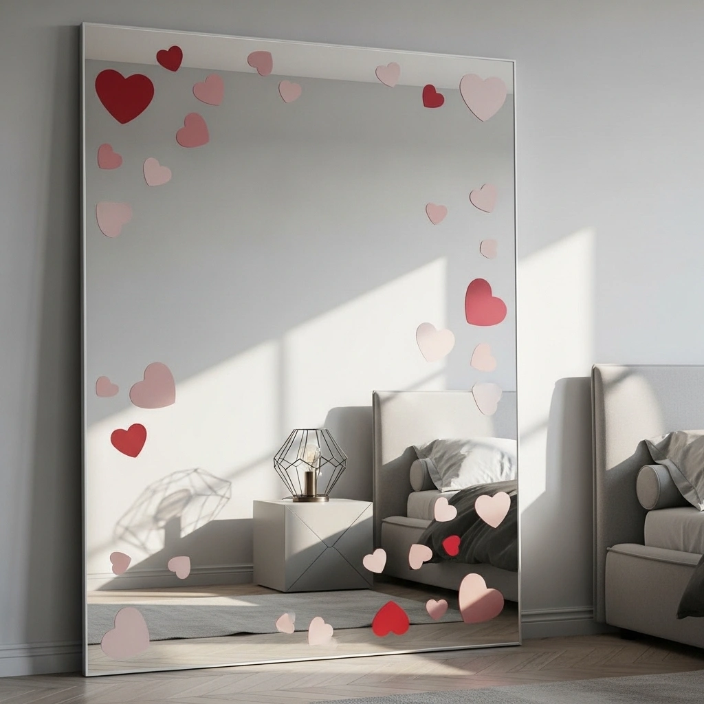 Create removable heart decals for mirrors. Use frosted vinyl or soft pink stickers. Place them lightly across the mirror surface. The reflection doubles the romantic effect. It feels subtle but festive. This works well in bedrooms or entryways.